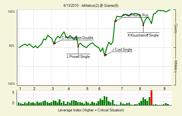 The Game was close up until the sixth inning when the giants scored three runs on back to back home runs. The bullpen tried their best to blow this one but held the ship together to get Cain the win. The offense even added some insurance in the bottom of the 8th on the second 2 run home run from Huff to give the night off.