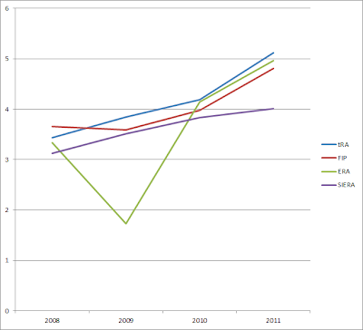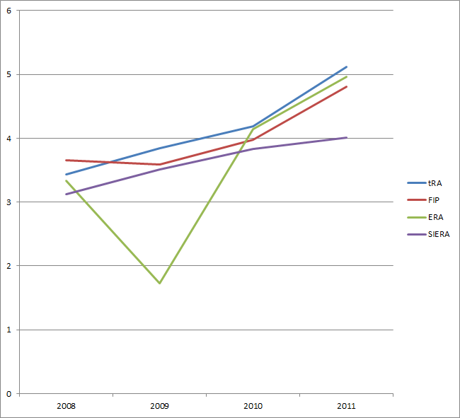 To be perfectly frank, I don't think what we are seeing now is the funk. What was out of the ordinary was his 2009 season where he posted a 1.73 ERA, while his other numbers all remained around his career norms. To help illustrate just how much of a blip 2009 was, here is a nifty chart that plots his ERA along with some advanced stats that look to strip out things beyond a pitchers control.