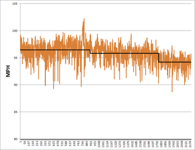 The orange lines are each fastball while the black line represents the season average. The drop this season is fairly large and quite noticeable.