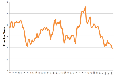 Here is the Giants ten game moving average of runs per game.